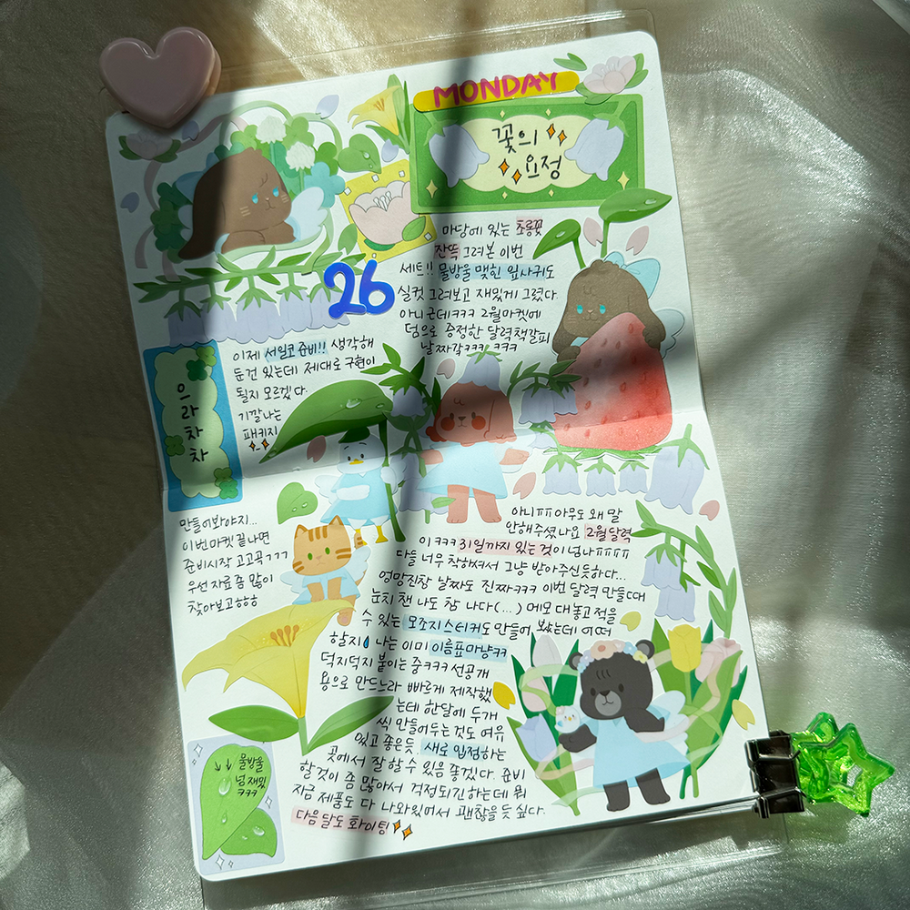 봄에 어울리게 파스텔톤과 꽃들을 많이 그려 넣었어요.