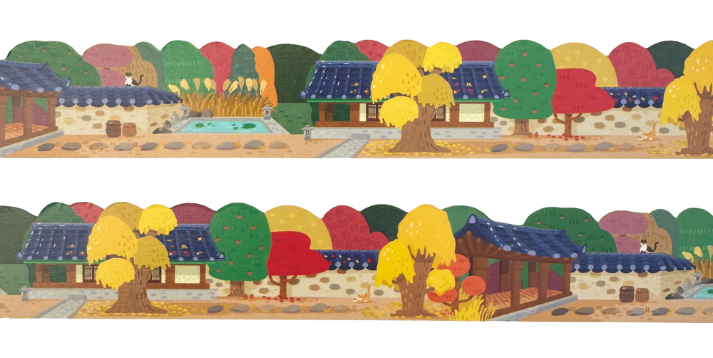 가지각색의 단풍들과 낙엽이 쌓인 마당의 모습과