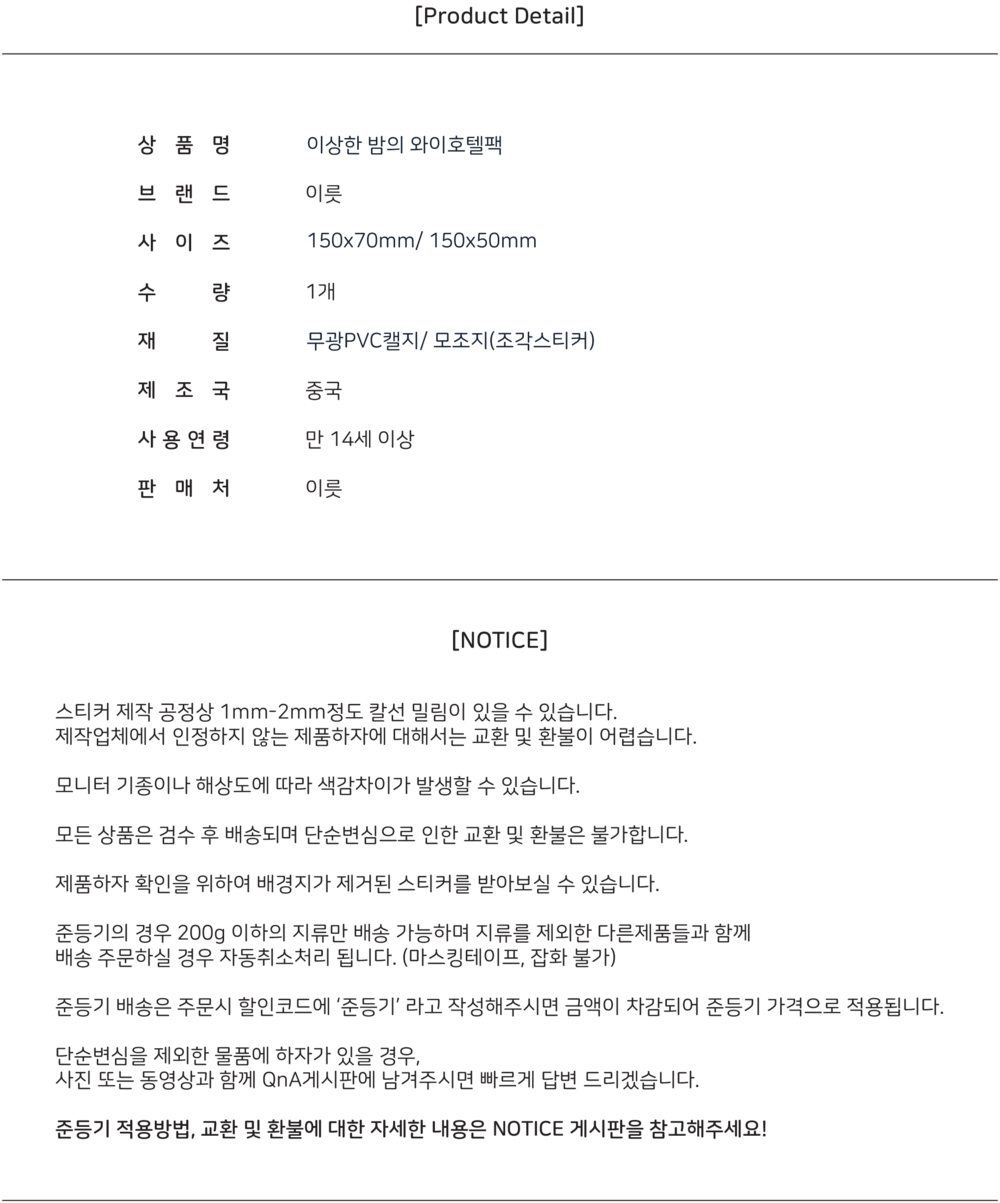 - 제품 특성상 단순 변심, 부주의에 의한 제품 손상 및 파손, 사용 및 개봉한 경우 교환/반품이 불가합니다.
