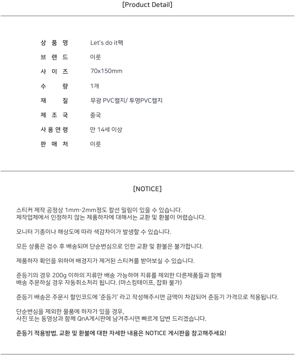 - 제품 특성상 단순 변심, 부주의에 의한 제품 손상 및 파손, 사용 및 개봉한 경우 교환/반품이 불가합니다.