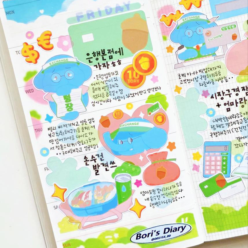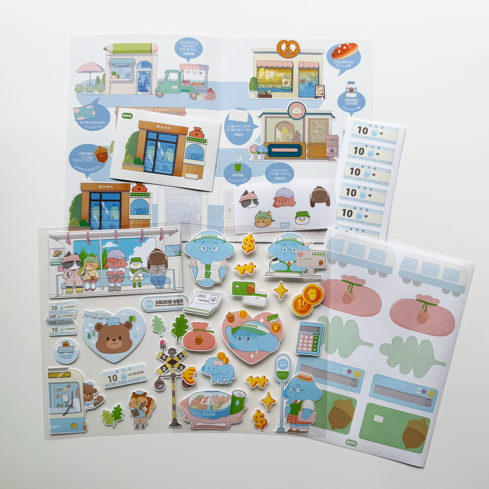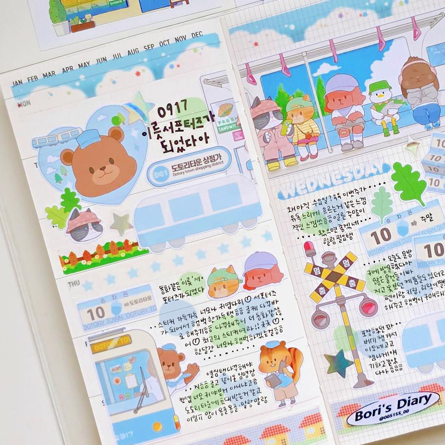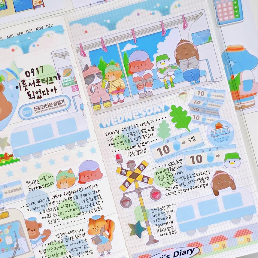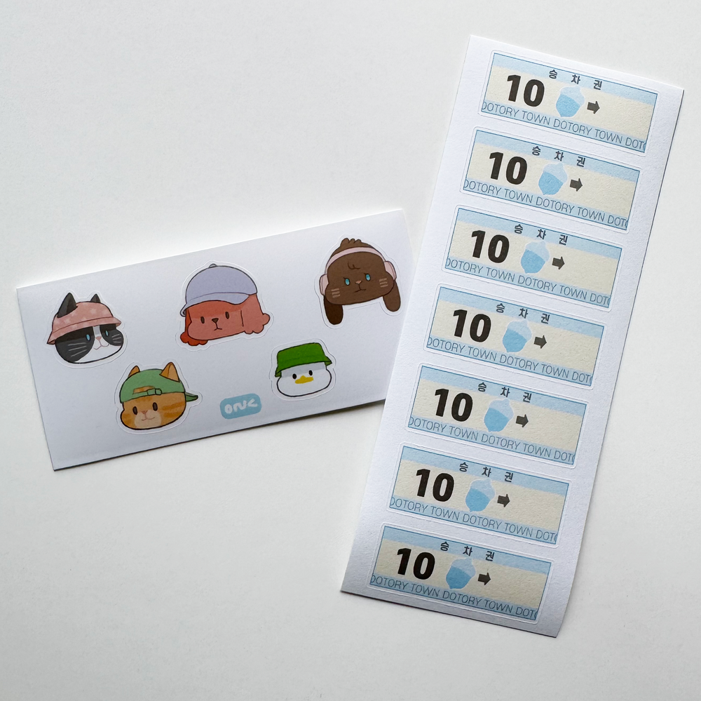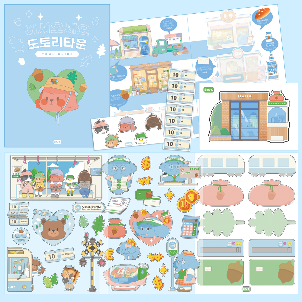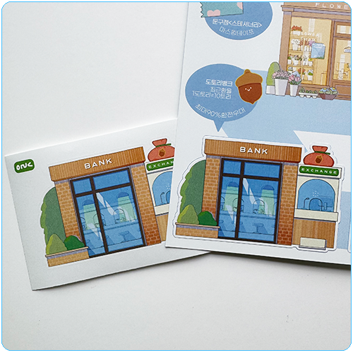 두가지 메인 스티커와 잘 어울리는 모조지스티커 1장의 구성의 도토리타운 세번째 팩입니다.
